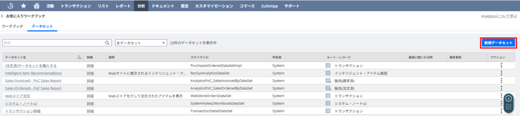 分析ホーム画面にて「データセット」タブをクリックし、画面右側の「新規データセット」ボタンを押下します。