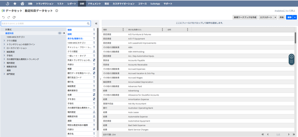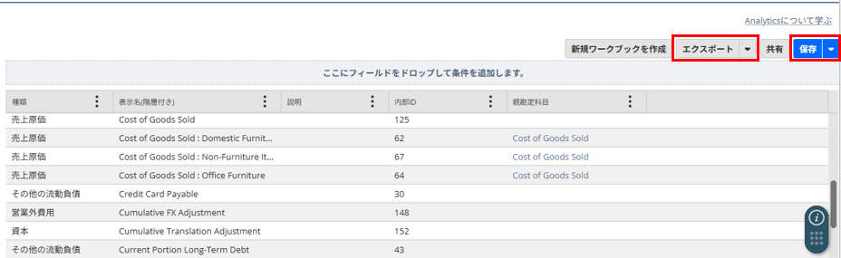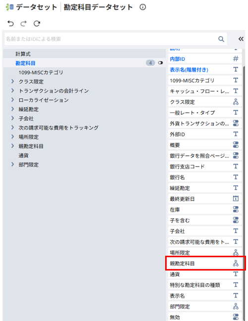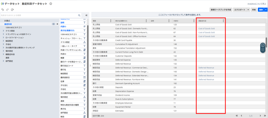 画面左側のフィールド一覧内にて、「保存検索」の「結果」には表示されなかった「親勘定科目」が確認できます。