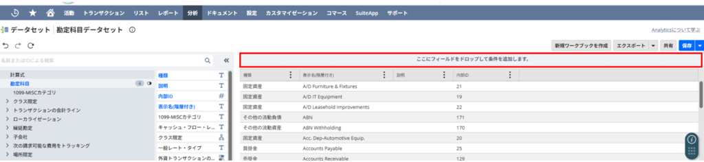 また、「ここにフィールドをドロップして条件を追加します」と書かれた欄にフィールドをドラッグすることで、表示させるレコードの条件を設定することができます。