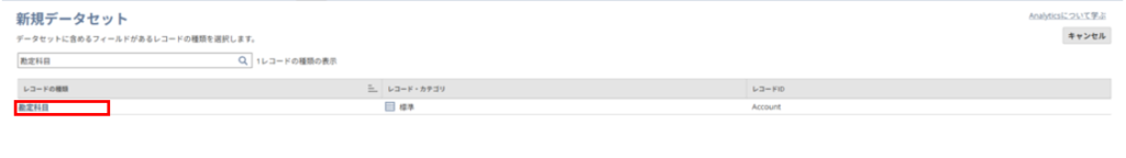参照したいレコードの種類を検索欄に入力します。ここでは「勘定科目」と入力し、表示されたリンクをクリックします。