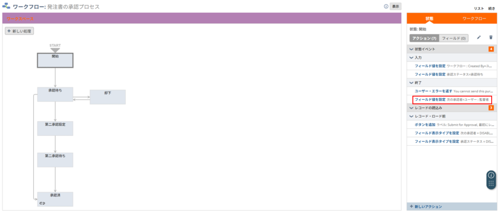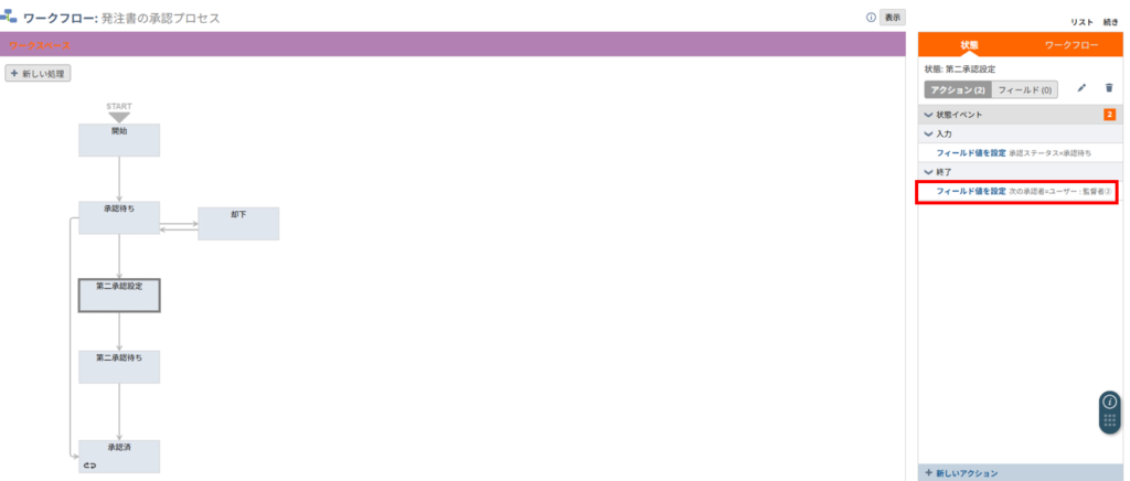 「状態」フィールドにて選択した処理に、アクションが追加されたことが確認できます。