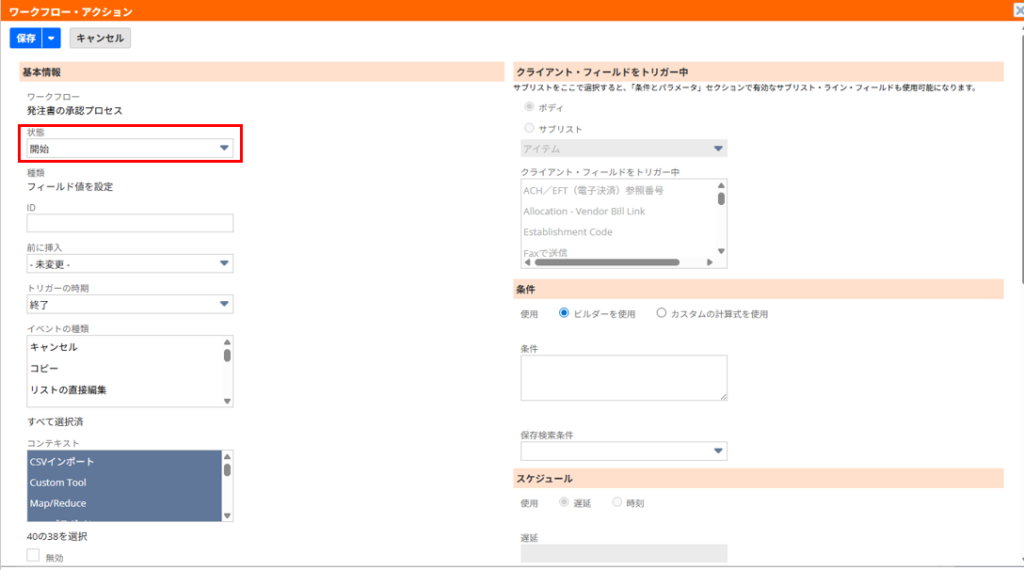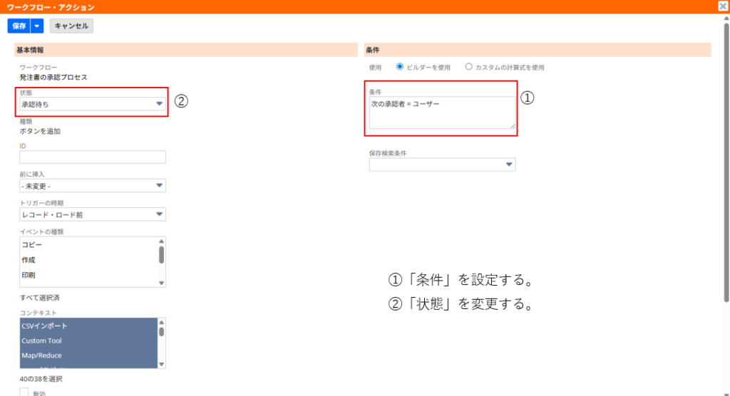 その際、アクションの「条件」を変更する必要がある場合は「状態」フィールド変更前に実施する。