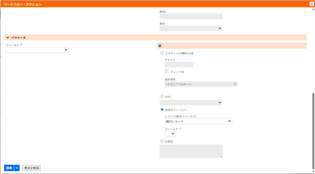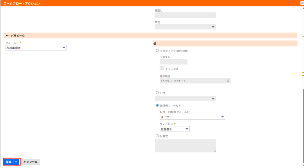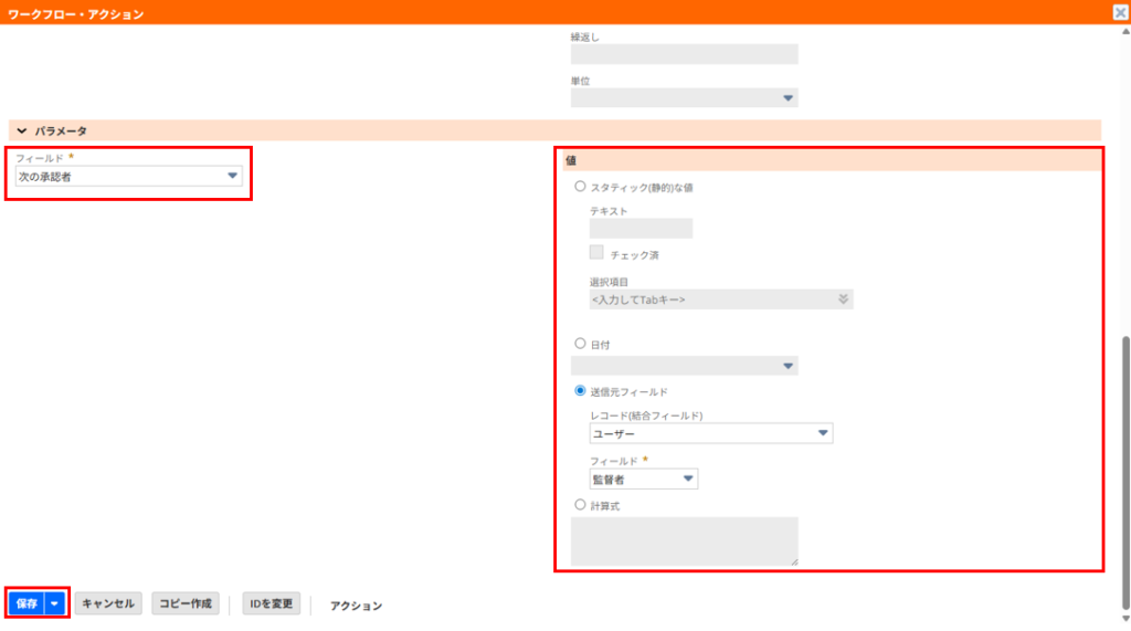 ④フィールドの選択やフィールド値のセットなど、実行したいアクションの内容を設定した後、「保存」ボタンを押下する。