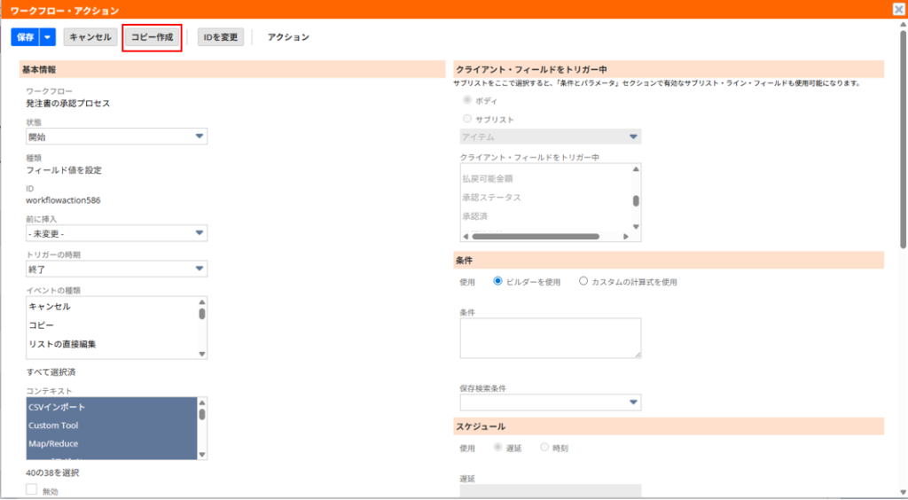 ②ワークフロー・アクション編集画面上部にある「コピー作成」ボタンを押下する。