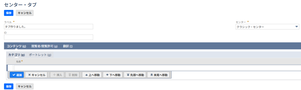 ラベルにカテゴリ名、センターの種類に紐づけたいセンターを指定します。今回はクラシック・センターを指定します。そして前項で作成したタブを指定してあげます。IDはタブを作ったときと同じです。