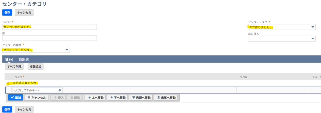 カスタマイゼーション→センター及びタブ→センター・カテゴリ→新規で新規カテゴリを追加していきましょう。