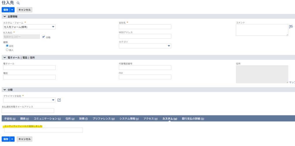 仕入先マスタを新規作成を開いてみるとフィールドが追加されています。