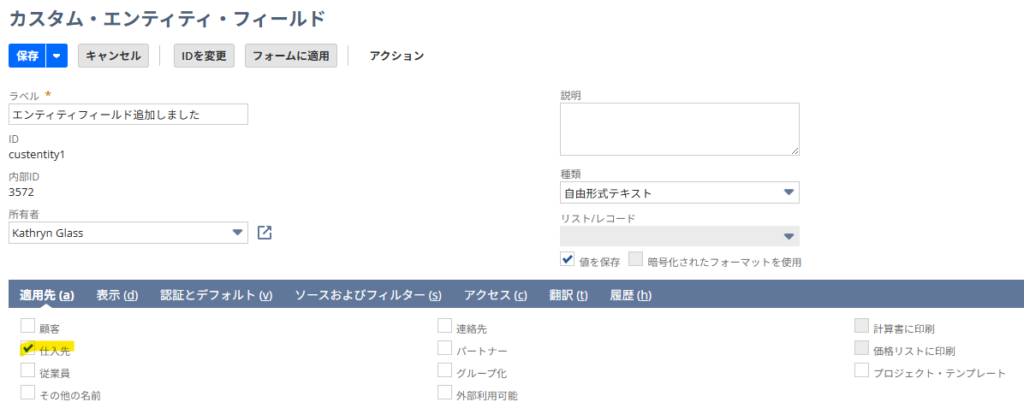 エンティティフィールドは主にマスタにフィールドを追加します。「エンティティフィールドを追加しました」という名前で新規登録します。