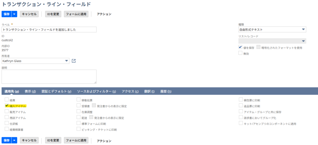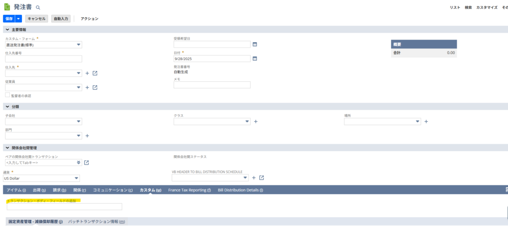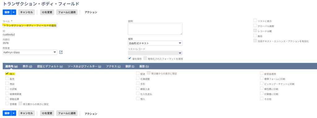 トランザクションボディフィールドはトランザクションテーブルに対して新規フィールドを作成します。下の例では発注書にフィールドを追加しています。